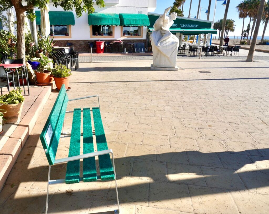 El banco se ha instalado en el Paseo Marítimo, junto a la estatua del Pescador, obra del escultor Roberto Manzano Hernández, un punto muy visitado por vecinos y turistas.